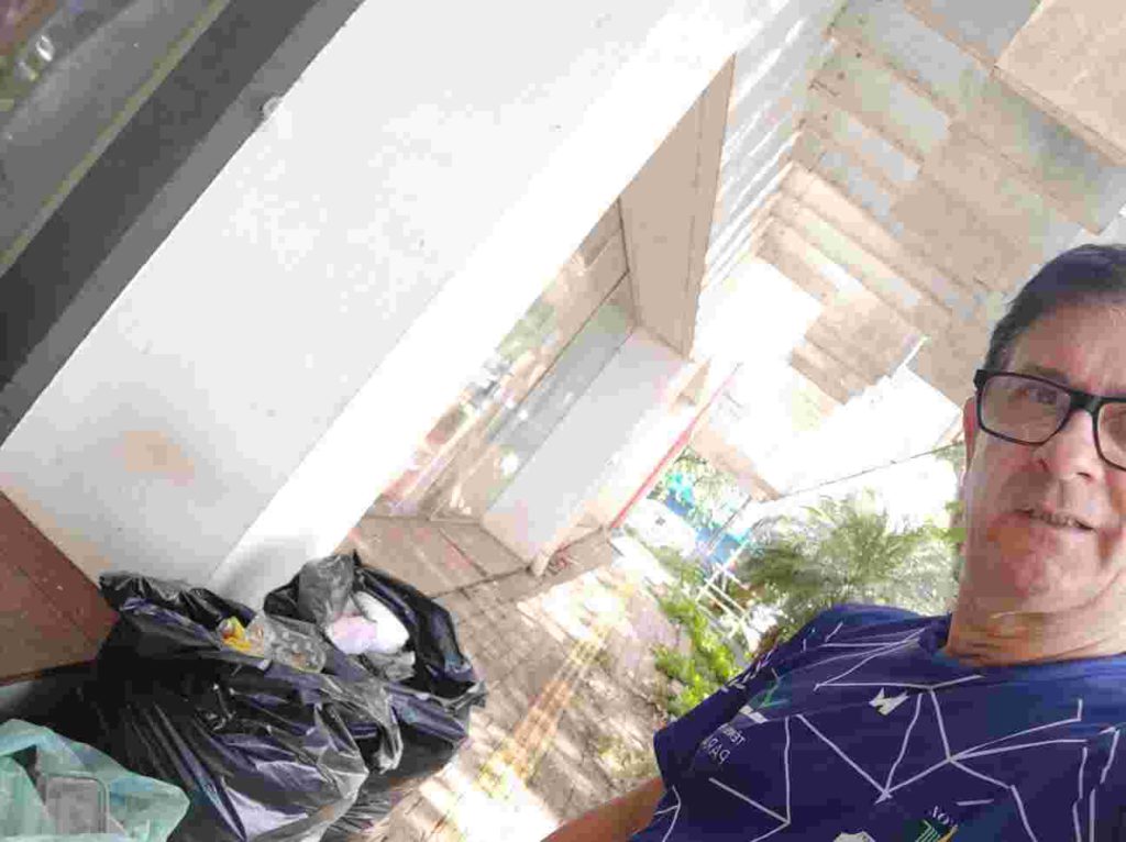 Diante da omissão da prefeitura de limpar, pelo menos, a calçada do edifício abandonado, apesar das queixas, Cidionir resolveu recolher, por conta própria, a sujeita acumulada.