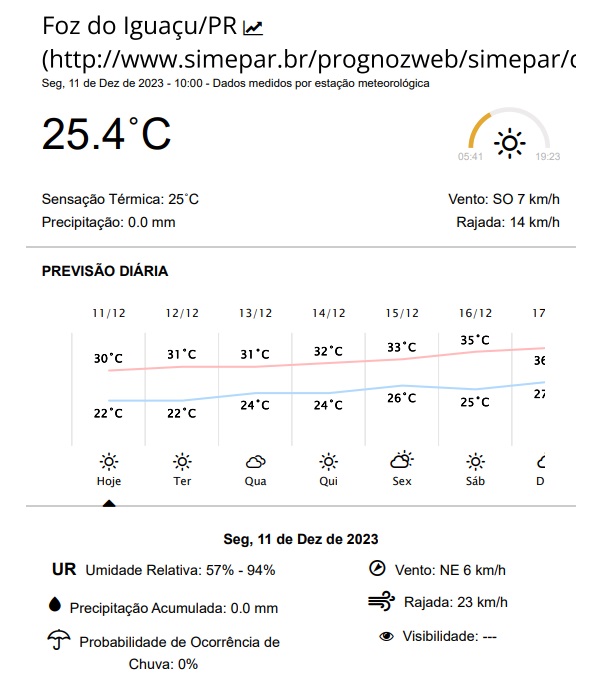 Nesta segunda-feira (11) a chuva deve dar um descanso, com um céu ensolarado em Foz e calor: mínima de 22 graus e máxima de 30 graus.
