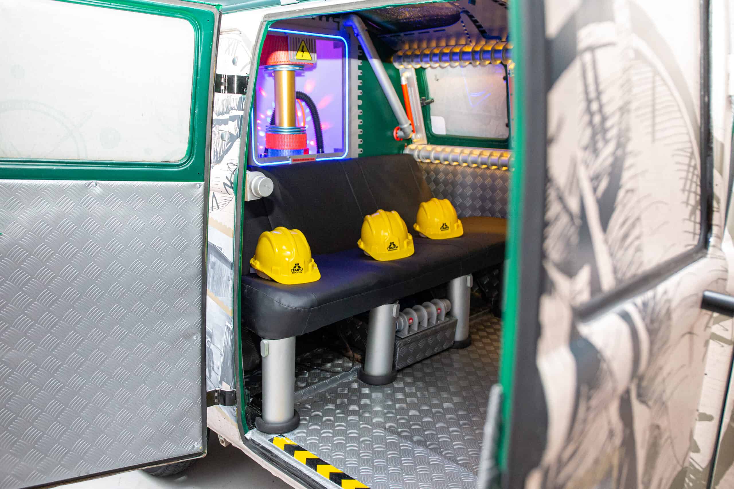 A escolha da Kombi como “túnel do tempo” faz referência a um dos principais meios de transporte utilizados à época pelos próprios barrageiros, reforçando o vínculo da atração com a memória da construção de Itaipu.