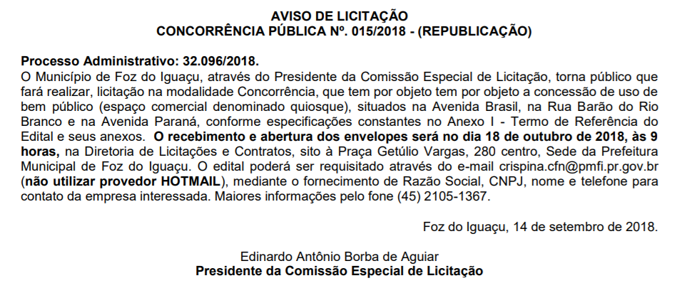O secretários de Turismo, Indústria, Comércio e Projetos Especiais, Gilmar Piolla, deve estar feliz da vida. A Prefeitura de Foz do Iguaçu abriu, no último dia 14, licitação para o uso comercial dos quiosques localizados nas avenidas Brasil, Paraná e na rua Rio Branco.