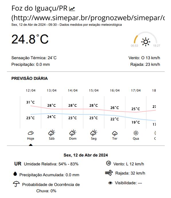 Sexta-feira com previsão de céu encoberto, a partir da 17 horas, e quente em Foz do Iguaçu: máxima de 31 graus.
