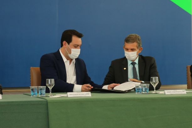 Ratinho Jr, à esquerda, e o general Silva e Luna formalizam a duplicação. Foto: Geraldo Bubniak/AEN PR