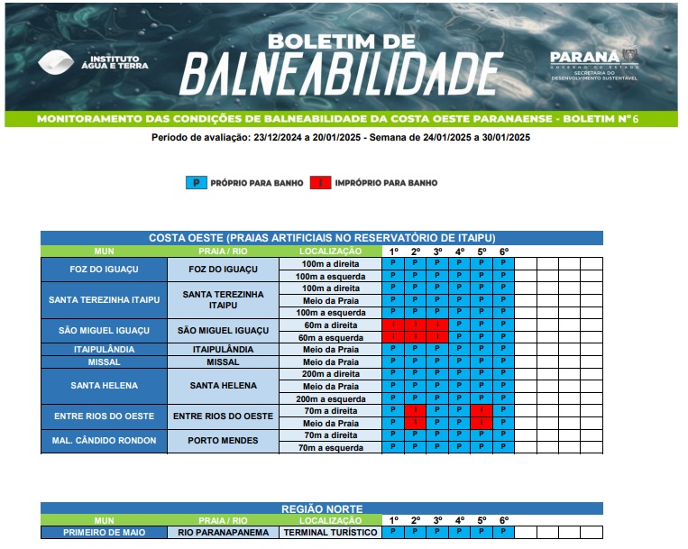 O boletim comprova que todas as praias da chamada Costa Oeste, localizadas nas margens do Lago de Itaipu, estão próprias para banho.