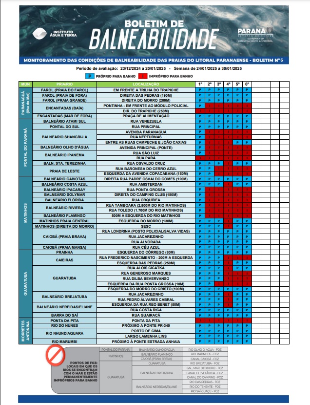 O último boletim de balneabilidade das praias do Paraná, divulgado ontem (24) pelo Instituto Água e Terra (IAT), válido para o período de 24 a 30 de janeiro, mostra um grande contraste entre as praias de água doce e de água salgada no estado.