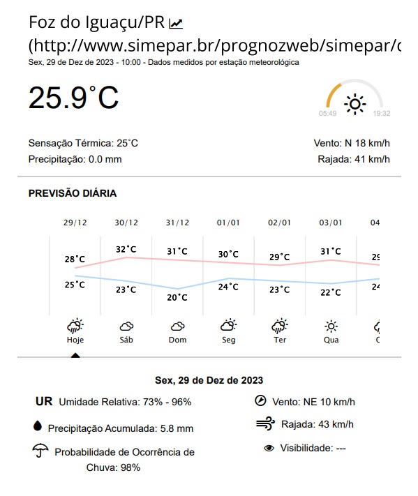 Sexta-feira (29) com previsão de pancadas de chuva em Foz do Iguaçu, principalmente à tarde, e temperaturas entre 25 e 28 graus, segundo o Simepar.