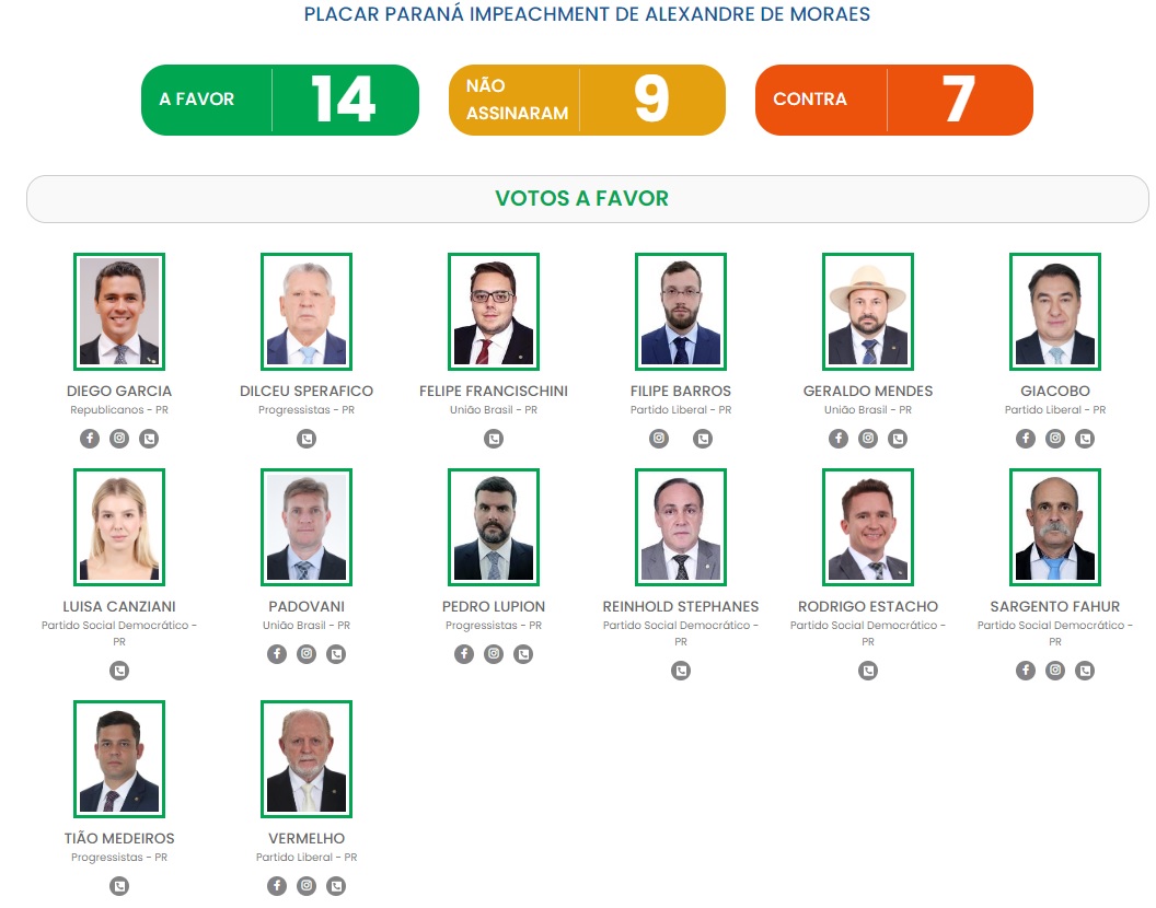 Na última quarta-feira, 11 de setembro, o Não Viu? publicou a posição dos deputados federais do Paraná, quanto ao impeachment do ministro do STF Alexandre de Moraes, no qual estava demonstrado que a maioria deles era contra a medida (vejam AQUI).