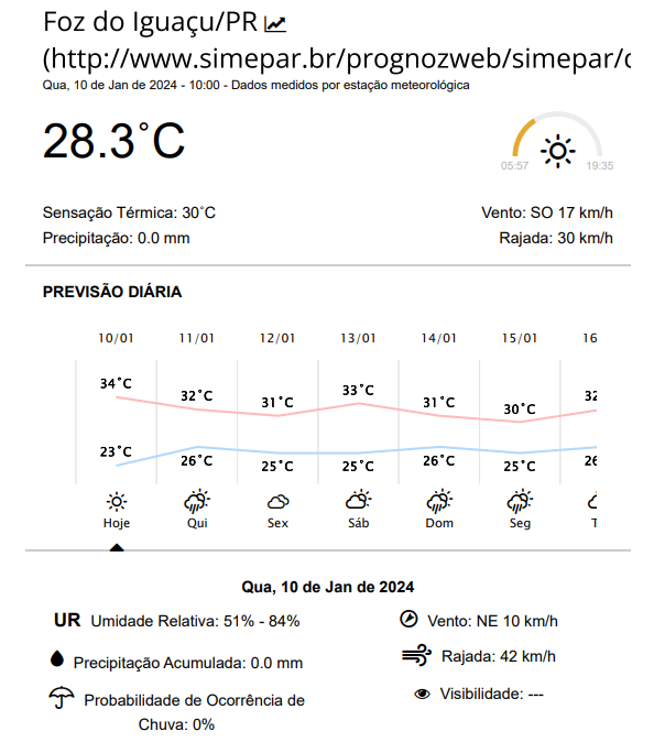 Em Foz do Iguaçu, quarta-feira (10) ensolarada com temperaturas entre 23 e 34 graus.
