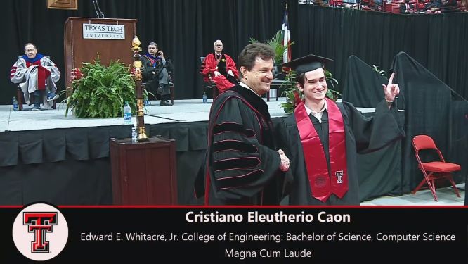 Cristiano Caon, foi aluno do Xodó da Vovó e do Colégio Anglo-Americano, onde também cursou o High School. Na última semana, comemorou um grande feito, formou-se com louvor, em Bachelor’s degree in Computer Science and minors in Mathematics and German (Graduação em Ciência da Computação e especialização em Matemática e Alemão), na TEXAS TECH UNIVERSITY – TTU, nos Estados Unidos.