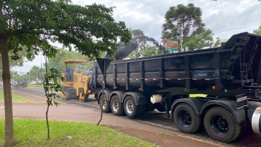 Em razão da chuva registrada ontem e do tempo instável de hoje, a aplicação de massa asfáltica na obra da Avenida Paraná não será realizada. Contudo, a pavimentação será retomada amanhã (sábado), conforme o cronograma estabelecido.