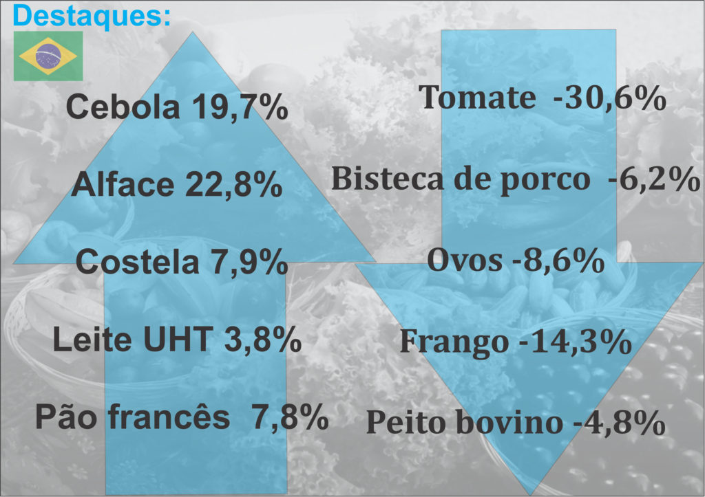 Entre os itens com maior variação positiva destacam-se as Hortaliças e verduras com aumento de 17,8%, Frutas com variação positiva de 10,4% e Leite e derivados com aumento de 5,9%.