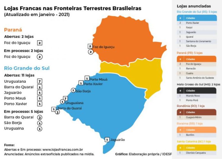 Segundo dados do site www.lojasfrancas.com.br, referência neste gênero de empreendimento, o país tem atualmente 13 lojas abertas e outras 7 estão em processo de liberação, totalizando 20 unidades pontuando nas regiões fronteiriças.