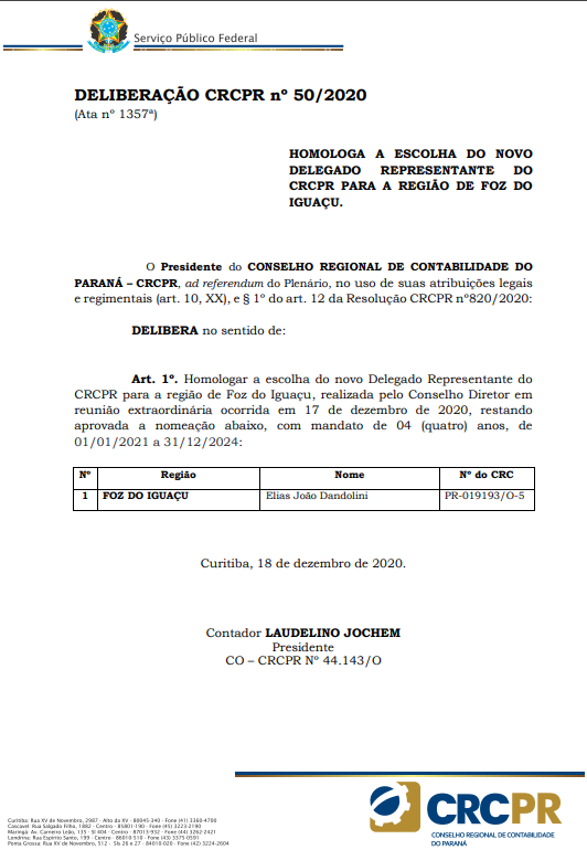 O contador Elias João Dandolini será o novo delegado representante do Conselho Regional de Contabilidade do Paraná para a região de Foz do Iguaçu.