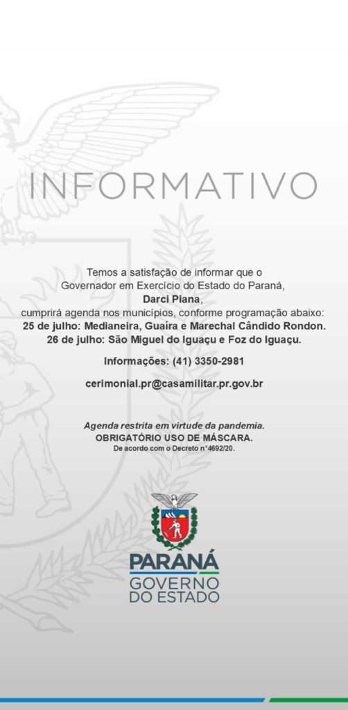 O governador em exercício do Paraná (Ratinho Jr. está no México), Darci Piana, visita Foz do Iguaçu na próxima segunda-feira (26) depois de passar por São Miguel do Iguaçu.