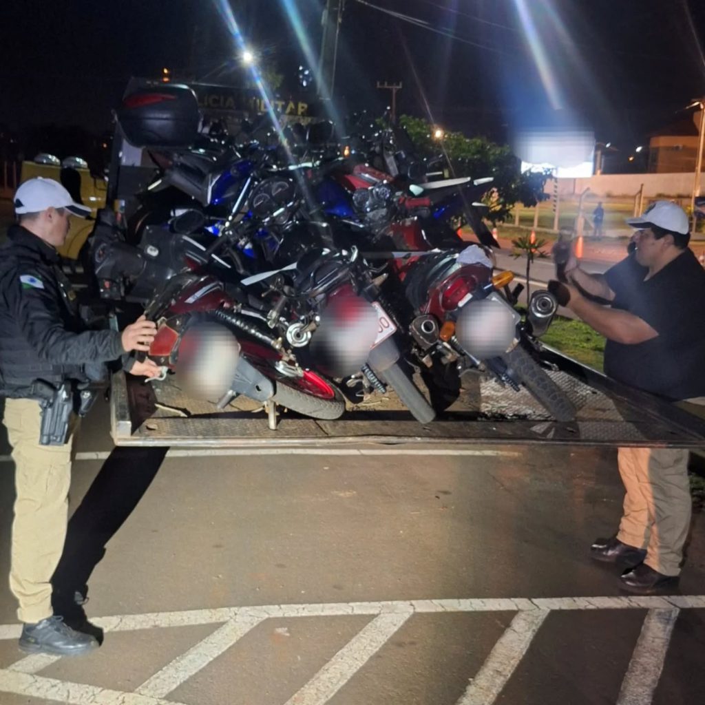 O primeiro ponto de bloqueio, na região Nordeste, resultou na abordagem de 61 motocicletas e de seus condutores. Durante as verificações de CRLV, CNH e pendências judiciais, 17 motocicletas foram removidas ao pátio do Foztrans pelo guincho do 14º BPM.