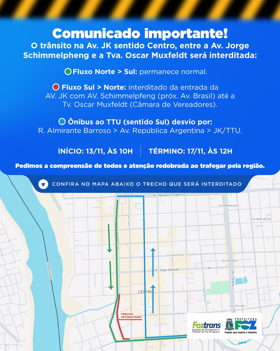 A Prefeitura de Foz do Iguaçu informa que um trecho da Avenida JK ficará interditado até a próxima segunda-feira, 17 de novembro.
