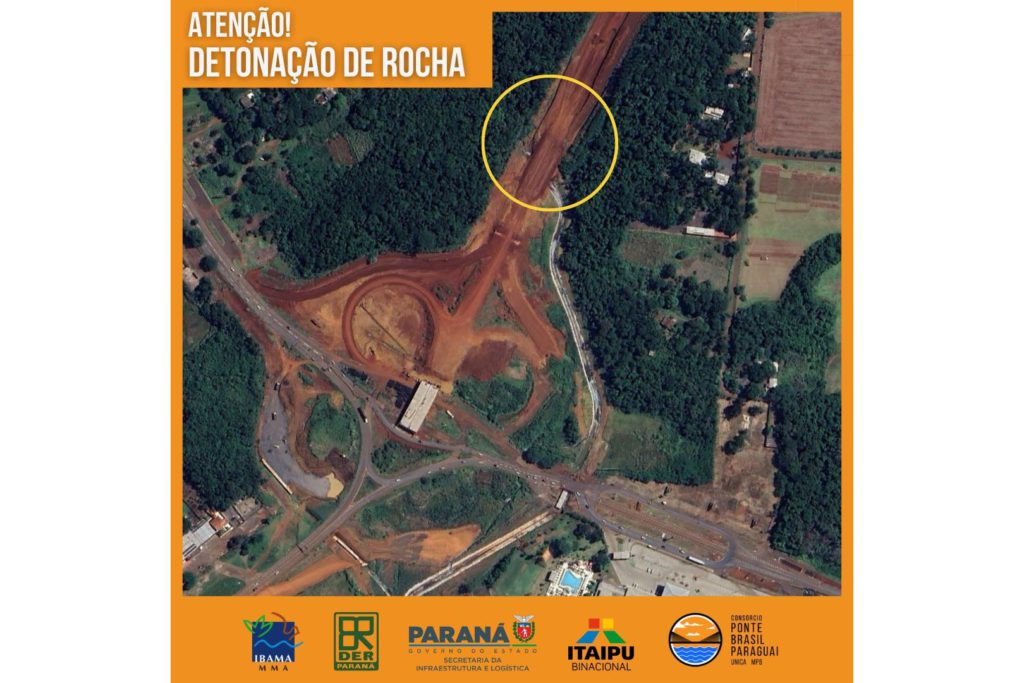 O Departamento de Estradas de Rodagem do Paraná (DER/PR) informa que serão realizadas esta semana detonações de rochas na obra da Perimetral Leste de Foz do Iguaçu, próximo ao viaduto no entroncamento com a BR-469.