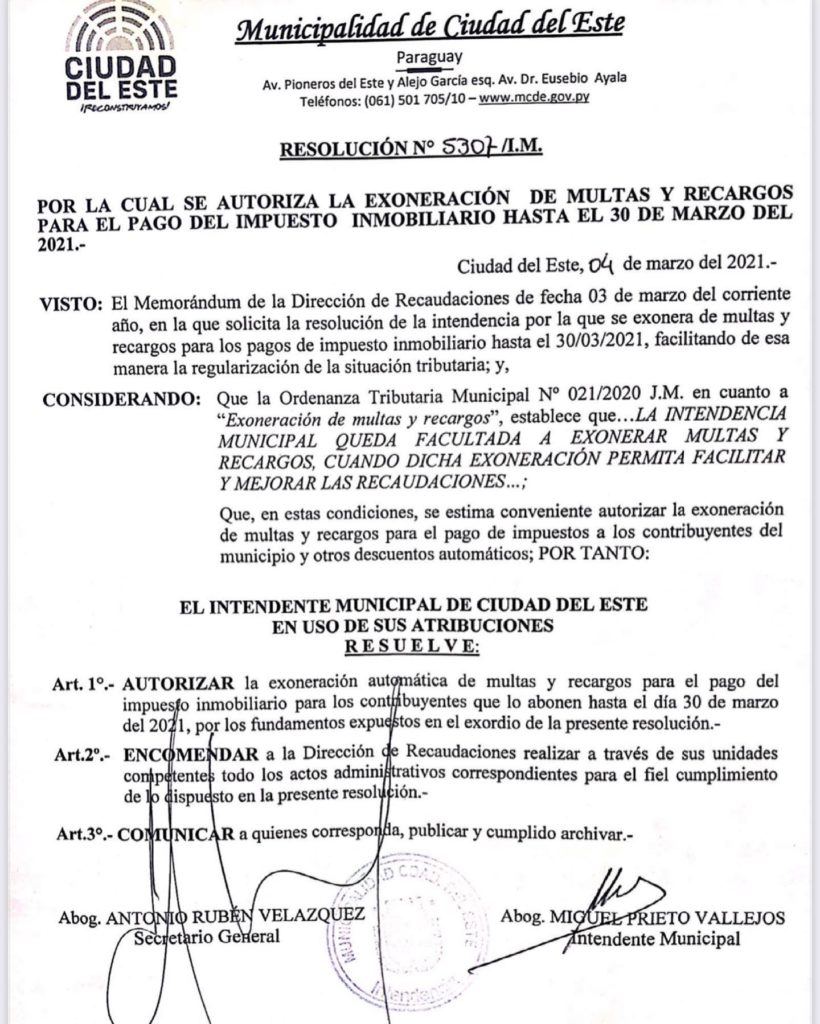 O município de Ciudad del Este, por meio da resolução nº 5.305 / IM, autorizou a isenção, até o dia 30 de março de 2021, de multas e sobretaxas para o recolhimento do imposto imobiliário (IPTU) que ainda não foi pago.