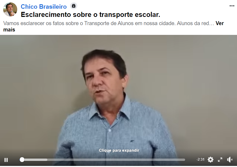 Em um vídeo postado na página dele no facebook, Chico, como sempre, culpou os “politiqueiros” pelo desgaste causado, em consequência da adoção deste novo modelo de transporte escolar.