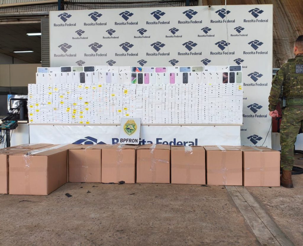 Durante a fiscalização veicular, foram localizadas caixas contendo aparelhos celulares da marca iPhone sem o devido desembaraço aduaneiro.