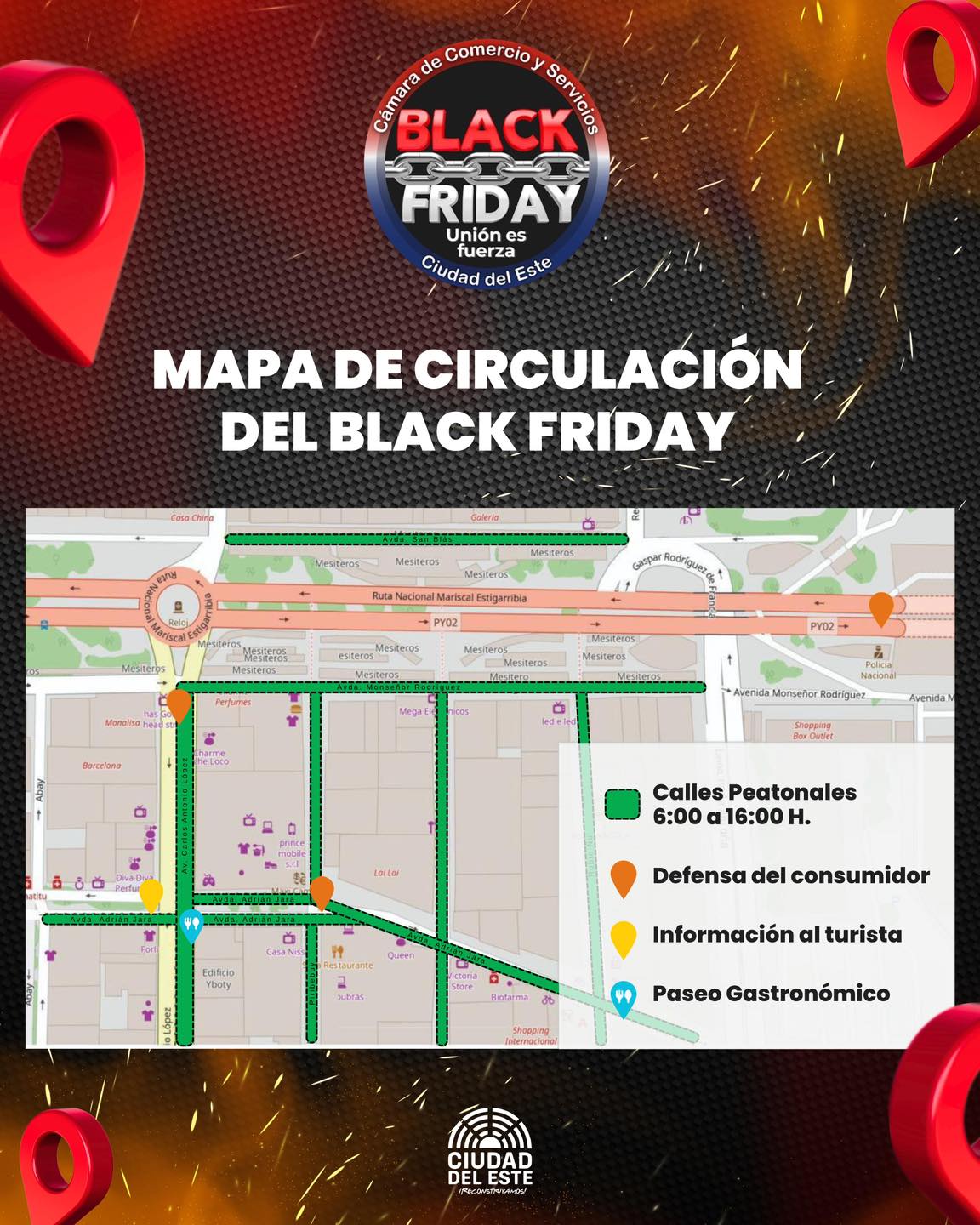 Por ocasião da Black Friday 2025, de 20 a 23 de novembro, a Prefeitura de Ciudad del Este informa que as seguintes ruas serão bloqueadas para a circulação de veículos e liberadas somente para pedestres: