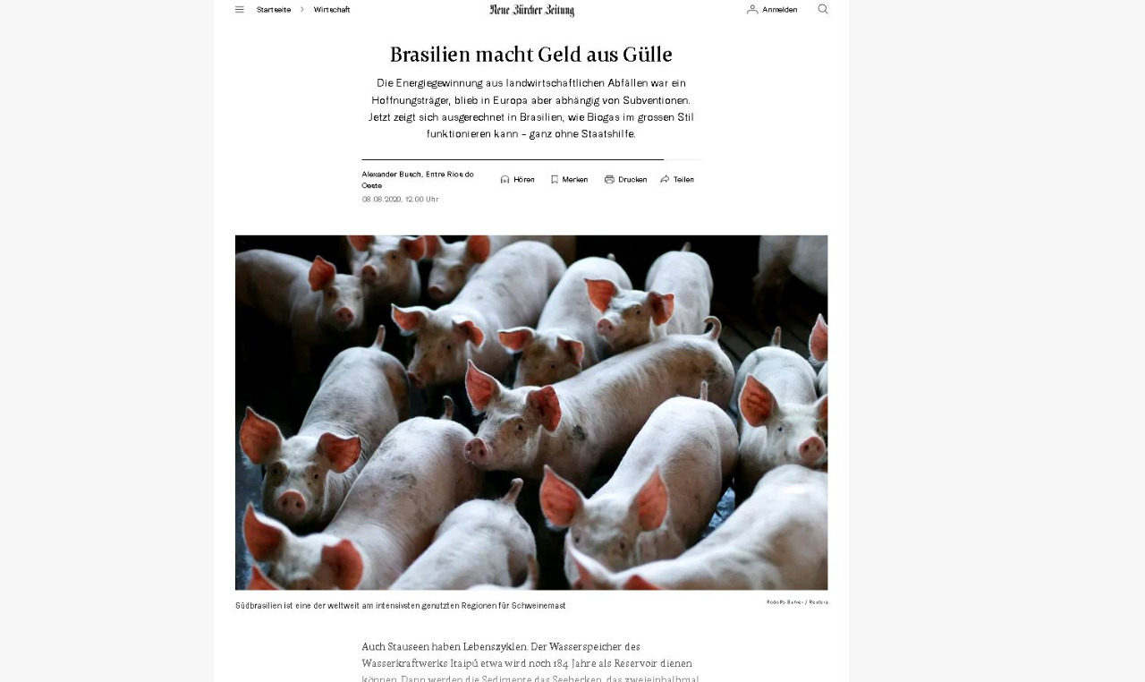 O jornal Neue Zürcher Zeitung, o mais antigo da Suíça e de grande prestígio na Europa, destacou ações desenvolvidas pela Itaipu Binacional e pelo Centro Internacional de Energias Renováveis (CIBiogás) para a promoção de tecnologias sustentáveis no Oeste do Paraná.