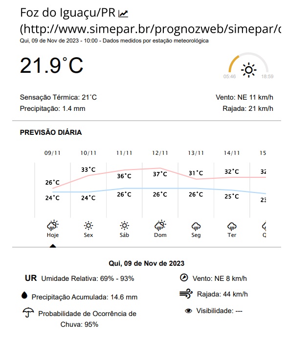 Quinta-feira (09) chuvosa em Foz do Iguaçu, com máxima prevista de 26 graus e possibilidade de tempestades.