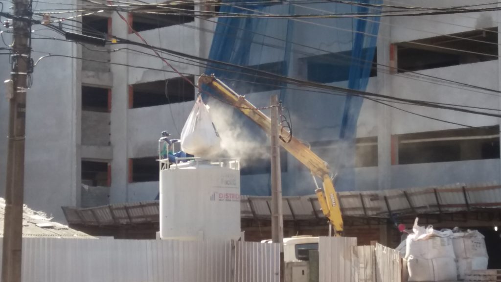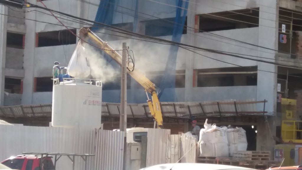 Um sistema de abastecimento de cal numa obra de um prédio na esquina das ruas Santos Dumont com Bartolomeu de Gusmão, no centro de Foz do Iguaçu, está, literalmente, espalhando o produto por toda redondeza.