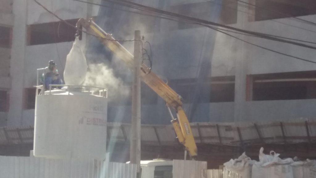 Um sistema de abastecimento de cal numa obra de um prédio na esquina das ruas Santos Dumont com Bartolomeu de Gusmão, no centro de Foz do Iguaçu, está, literalmente, espalhando o produto por toda redondeza.