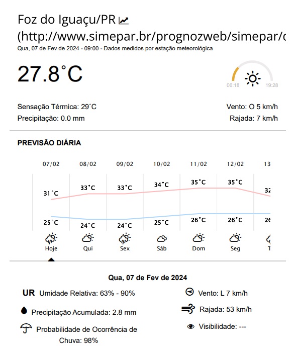 Quarta-feira (07) com previsão de pancadas de chuva em Foz do Iguaçu e calor: temperaturas entre 25 e 31 graus.