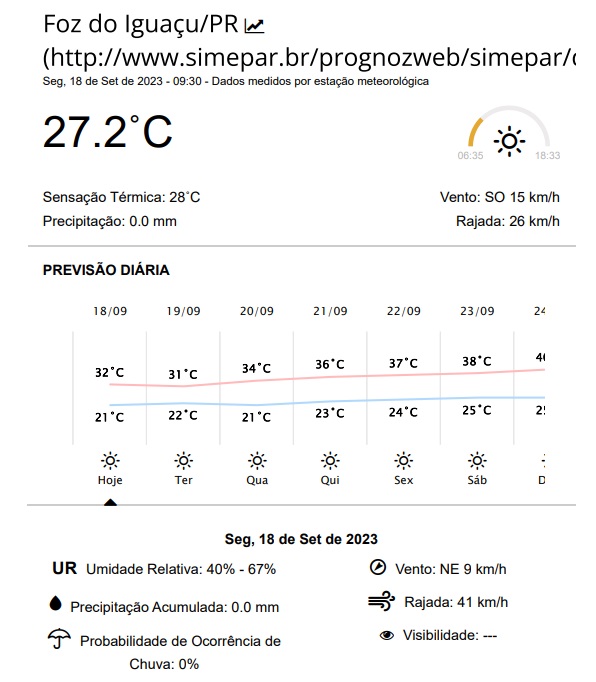 Segunda-feira (18), Dia dos Símbolos Nacionais, ensolarada em Foz do Iguaçu, com tempo seco e muito calor: 32 graus.