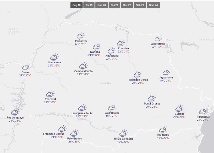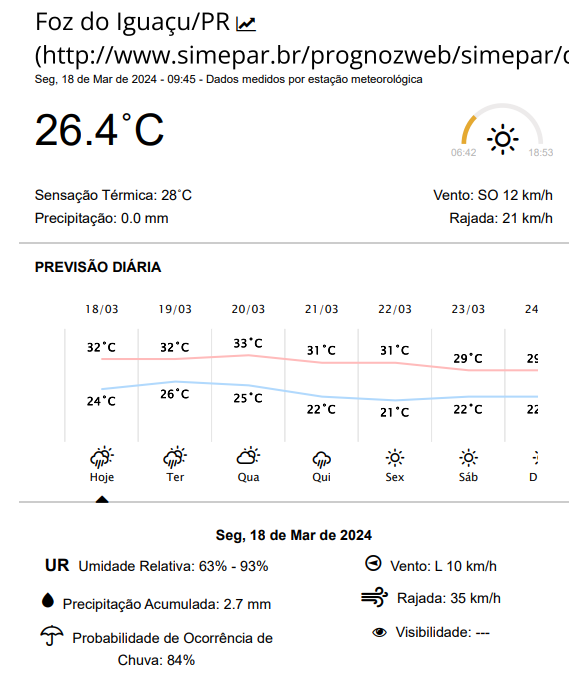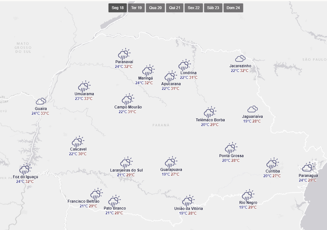 Segunda-feira com previsão de pancadas de chuva e risco de temporais localizados em Foz do Iguaçu. Temperaturas devem variar entre 24 e 32 graus.