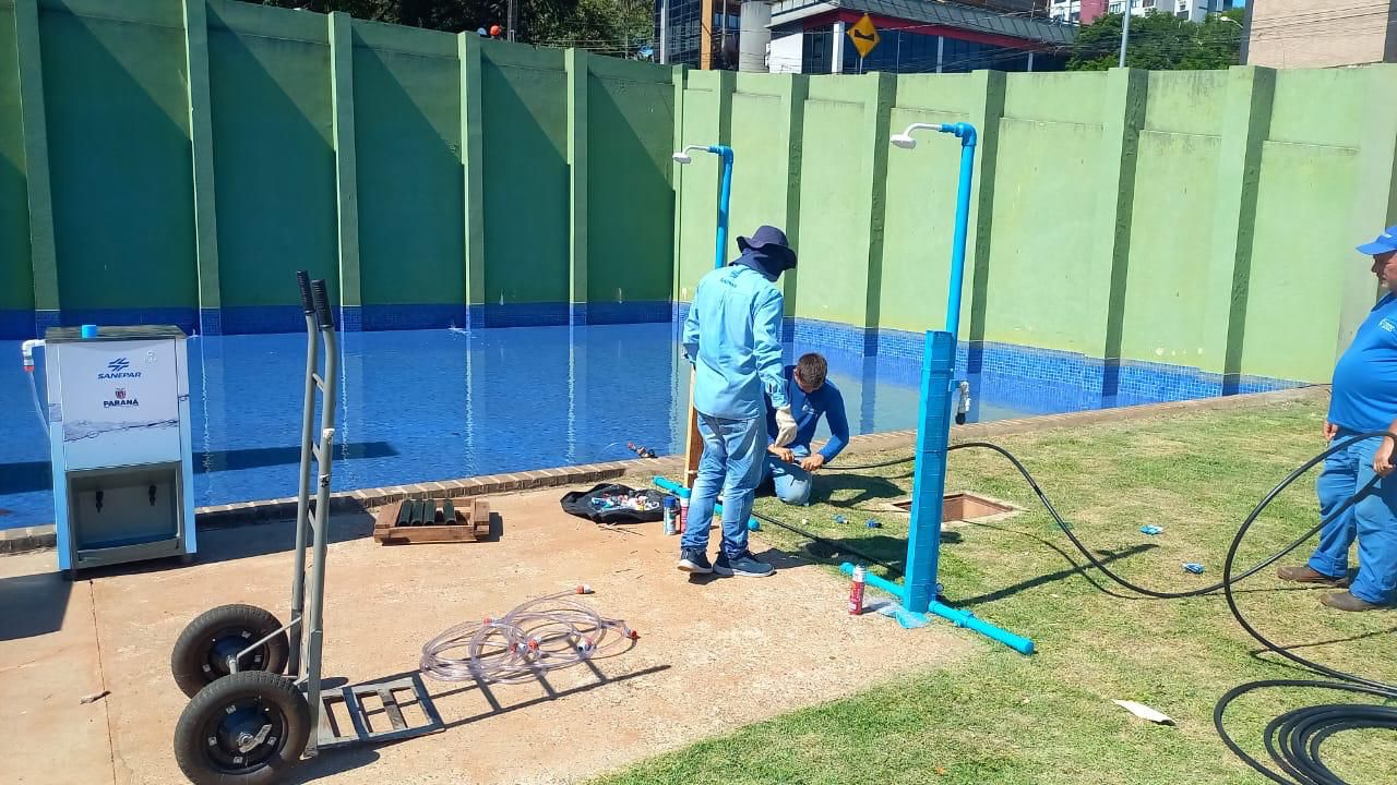 Instalção de duchas na Praça da Paz. Foto: PMFI/divulgação