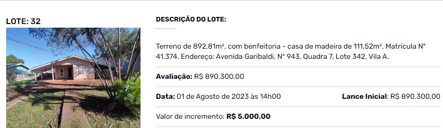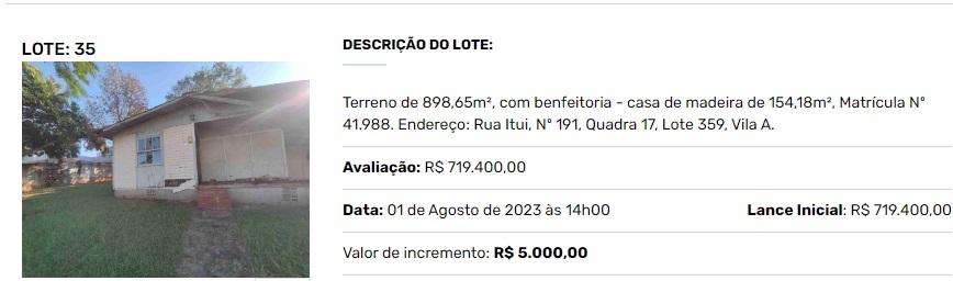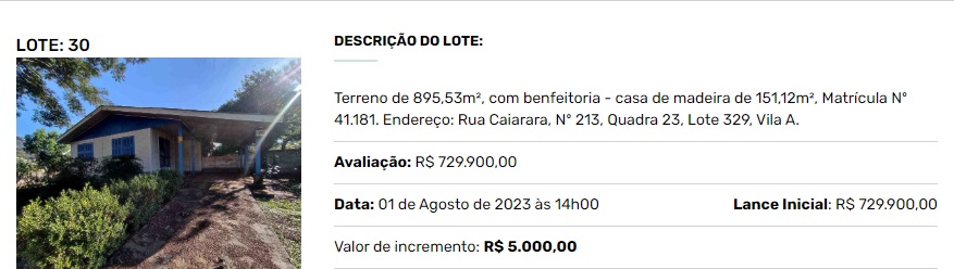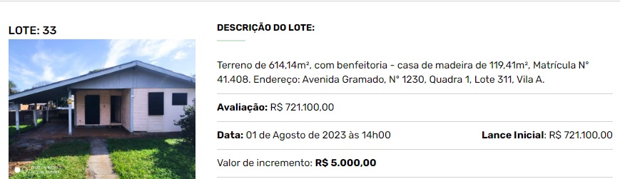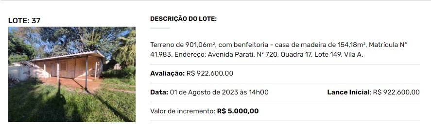Os imóveis serão vendidos em lotes individuais com valores iniciais entre R$ 159 mil e R$ 922 mil. As propostas deverão ter acréscimo mínimo de R$ 5 mil.