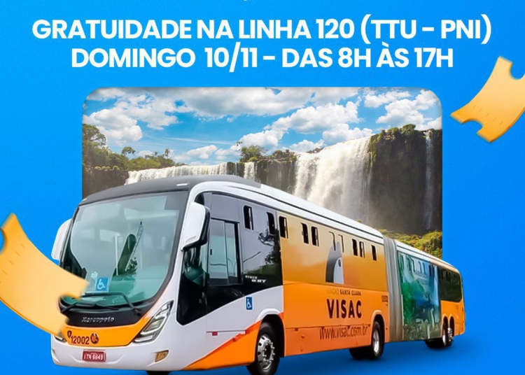 A linha 120 do transporte coletivo de Foz do Iguaçu, que realiza o trajeto entre o Terminal Turístico Urbano (TTU) até o Parque Nacional do Iguaçu (PNI), terá gratuidade neste domingo (10), das 8h às 17h. O objetivo é facilitar o acesso ao evento Cataratas Day, que também ocorre no domingo.
