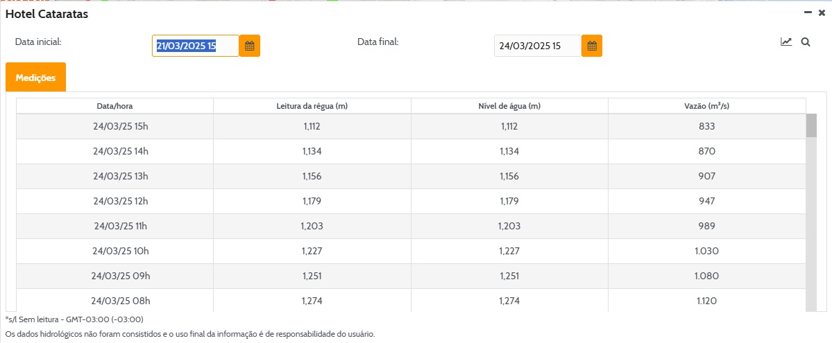 Hoje, 24 de março, às 17 horas, a vazão é de 768 mil litros por segundo, portanto praticamente a metade da vazão média das Cataratas do Iguaçu, que é de 1,5 milhão de litros por segundo.