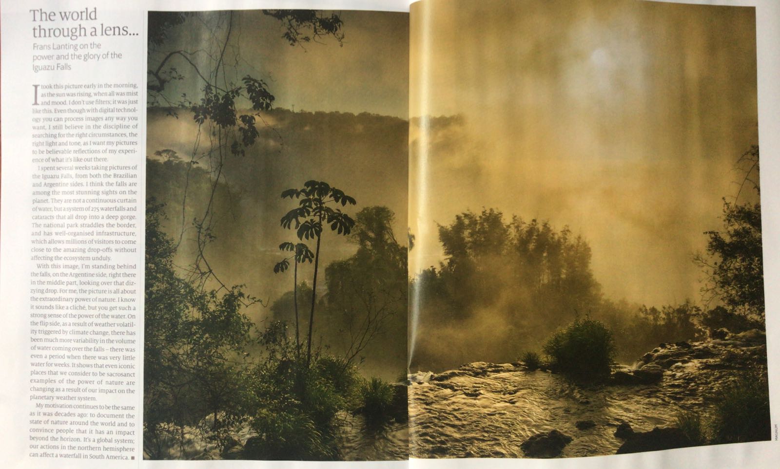 Ela é a capa da edição e as Cataratas do Iguaçu são o tema de uma reportagem especial da revista, sob o título “O mundo através das lentes” e o subtítulo ” Frans Lanting (autor da matéria) no poder e na glória das Cataratas do Iguaçu”.