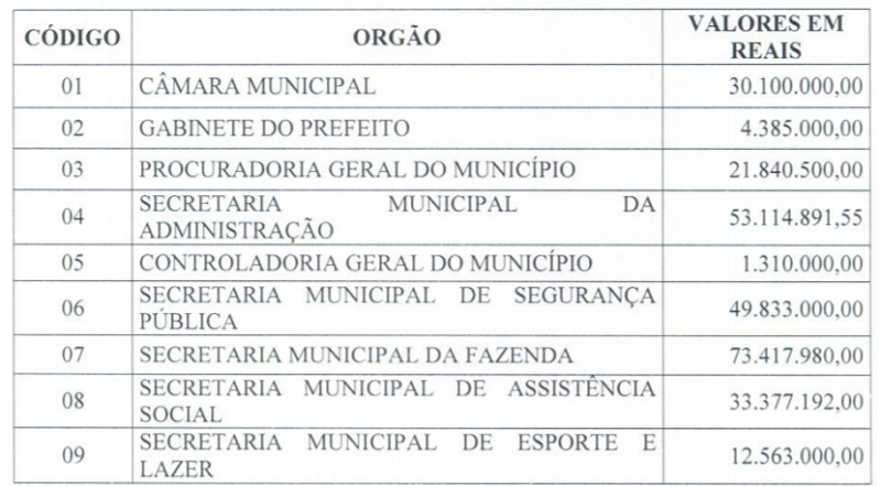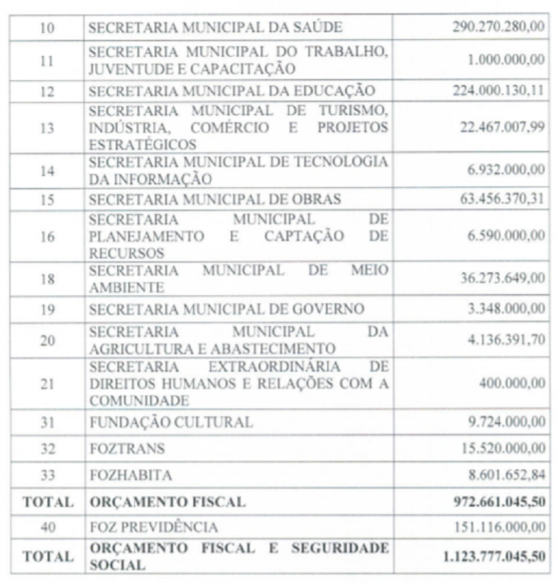 A proposta encaminhada ao Legislativo prevê orçamento global de R$ 1.123.777.045,50 (Um bilhão, cento e vinte e três milhões, setecentos e setenta e sete mil, quarenta e cinco reais e cinquenta centavos). Deste valor, R$ 151 milhões e 116 mil referem-se à ao orçamento da Previdência dos Servidores Municipais (Fozprev). O orçamento municipal atual é de R$ 1.093.177.753,77 podendo fechar o ano em valor acima do estimado devido ao superávit de arrecadação que vem se consolidando ao longo de 2018.