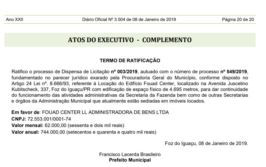 O Diário Oficial do Município (DOM), na edição de ontem (08), traz o termo de ratificação, reproduzido acima, pelo qual a Prefeitura de Foz do Iguaçu aluga o prédio do antigo Fouad Center, localizado na Avenida JK, para abrigar a Secretaria da Fazenda e “outras secretarias e órgãos da administração municipal que atualmente estão sediadas em imóveis locados”.