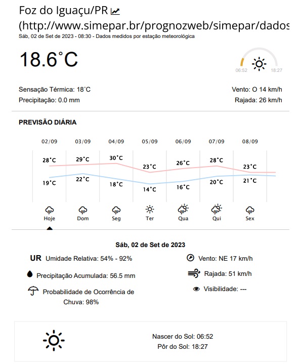 Sábado, dia 2 de setembro, data em que se comemora o Dia do Repórter Fotográfico e o Dia do Florista, chuvoso em Foz do Iguaçu, com máxima de 28 graus.