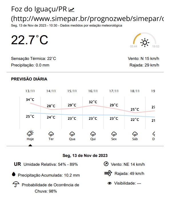 Segunda-feira (13) chuvosa em Foz do Iguaçu, com máxima de 34 graus e risco de tempestades.