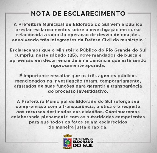 Por sua vez, a Prefeitura de Eldorado do Sul, emitiu a nota publicada acima.