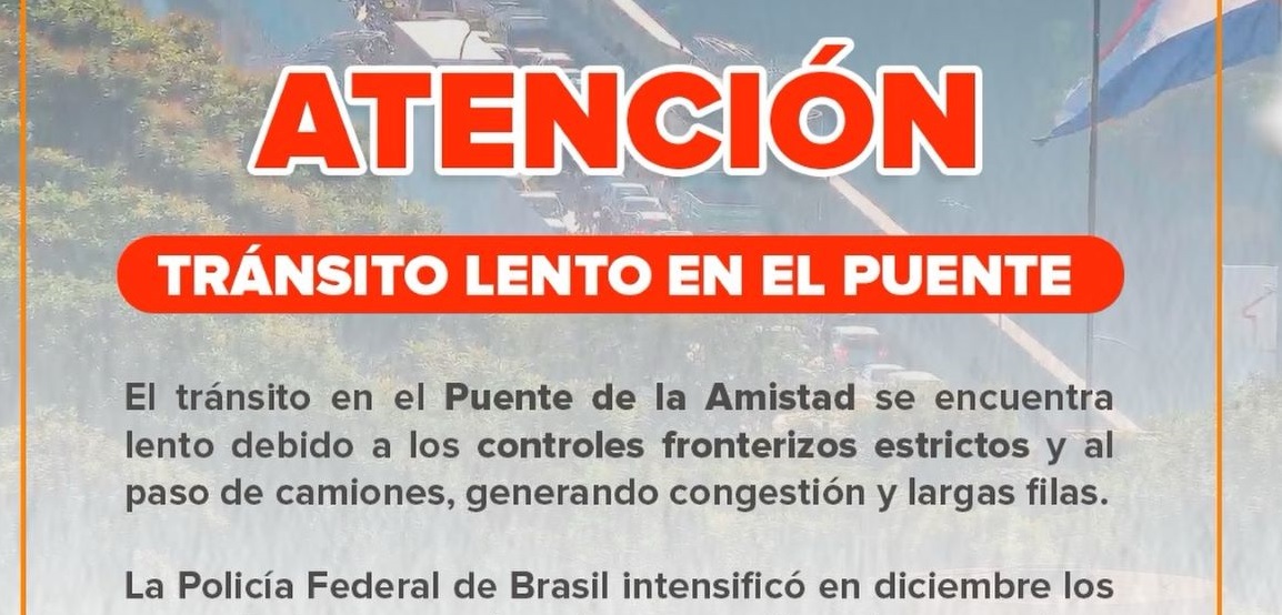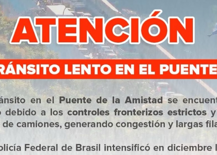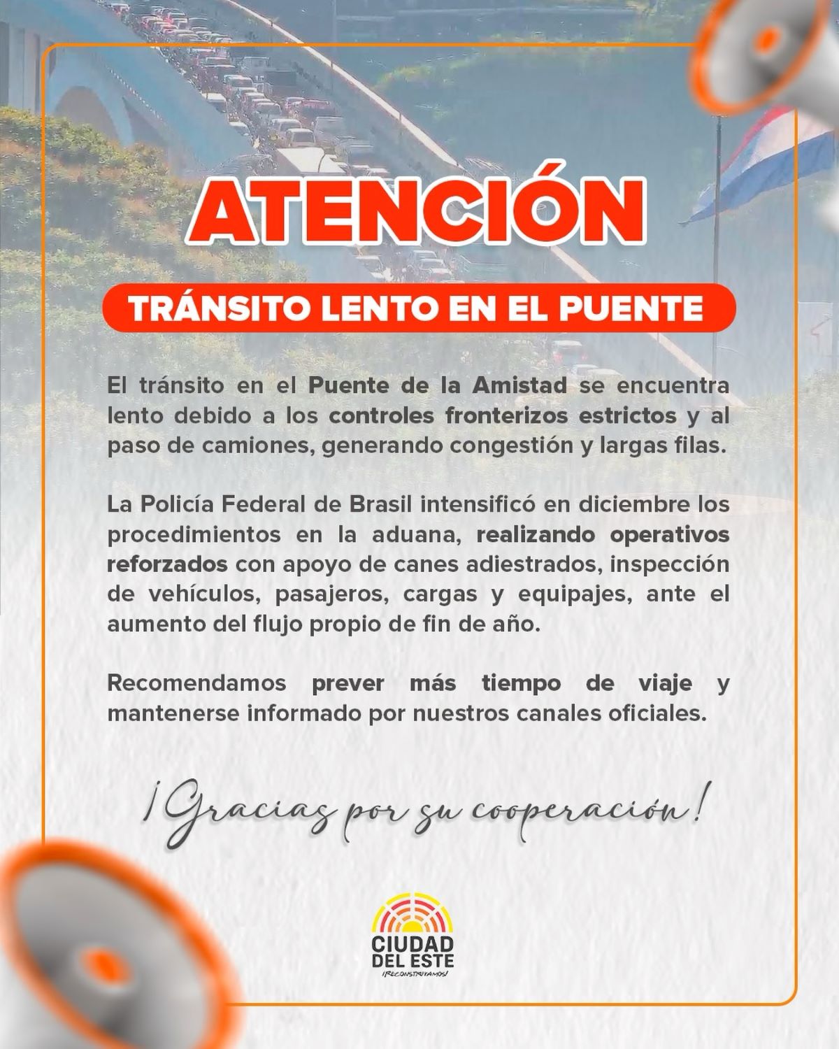 A Prefeitura de Ciudad del Este emitiu, na manhã desta quinta-feira (4 de novembro), um alerta oficial sobre a intensificação das fiscalizações da Polícia Federal do Brasil (PF) na alfândega brasileira da Ponte da Amizade, principal ligação entre o Paraguai e Foz do Iguaçu.