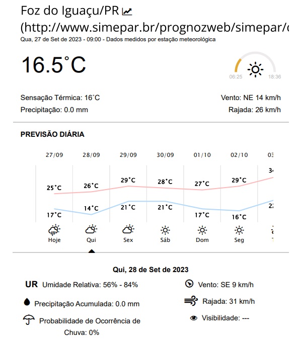 Depois do calorão que chegou 38,5 graus ontem (26), segundo foi registrado pela estação meteorológica do Simepar em Foz do Iguaçu, a temperatura despencou nesta quarta-feira: a máxima prevista é de 25 graus.