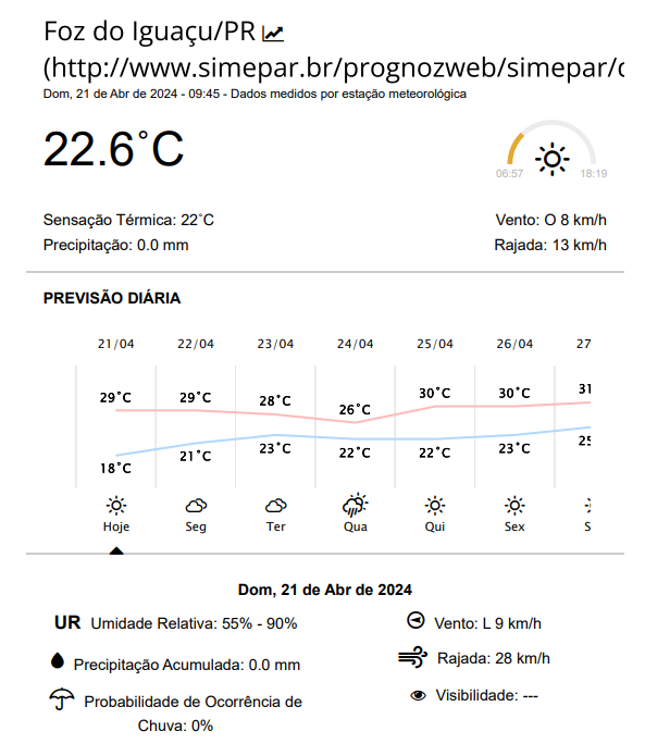 Domingo ensolarado em Foz do Iguaçu, com máxima prevista de 29 graus, a partir das 13 horas.