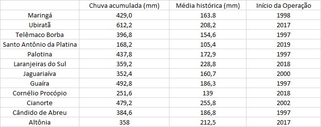 Um levantamento realizado pelo Sistema de Tecnologia e Monitoramento Ambiental do Paraná (Simepar) mostrou que a chuva acumulada de outubro em dez cidades de diferentes regiões do Estado foi 3.006,8 milímetros (mm), ante uma expectativa de 1.892 mm. Ou seja, cerca de 59% acima do esperado para o período.