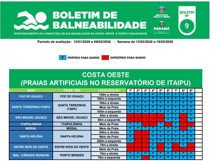 No novo boletim, as praias de São Miguel do Iguaçu e Missal deixaram a lista de restrição e voltaram a ser consideradas próprias para os banhistas.