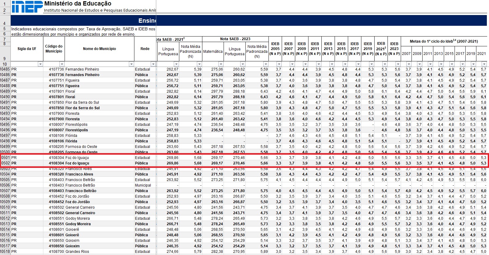 Em Foz do Iguaçu, o desempenho foi o seguinte: as escolas estaduais e municipais obtiveram nota 5,6, conforme mostra a tabela abaixo do MEC.