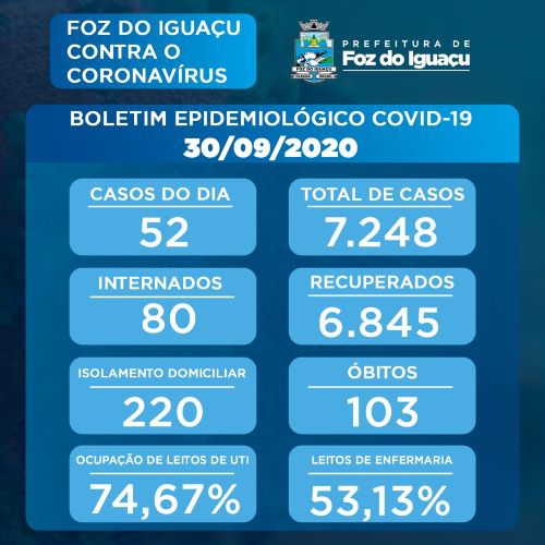 A Vigilância Epidemiológica de Foz do Iguaçu confirma na data de hoje, 30/09/2020, 52 casos de COVID-19, totalizando 7.248 casos da doença no município.