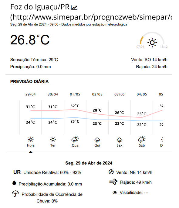 Segunda-feira de muito calor em Foz do Iguaçu, com máxima prevista de 31 graus.