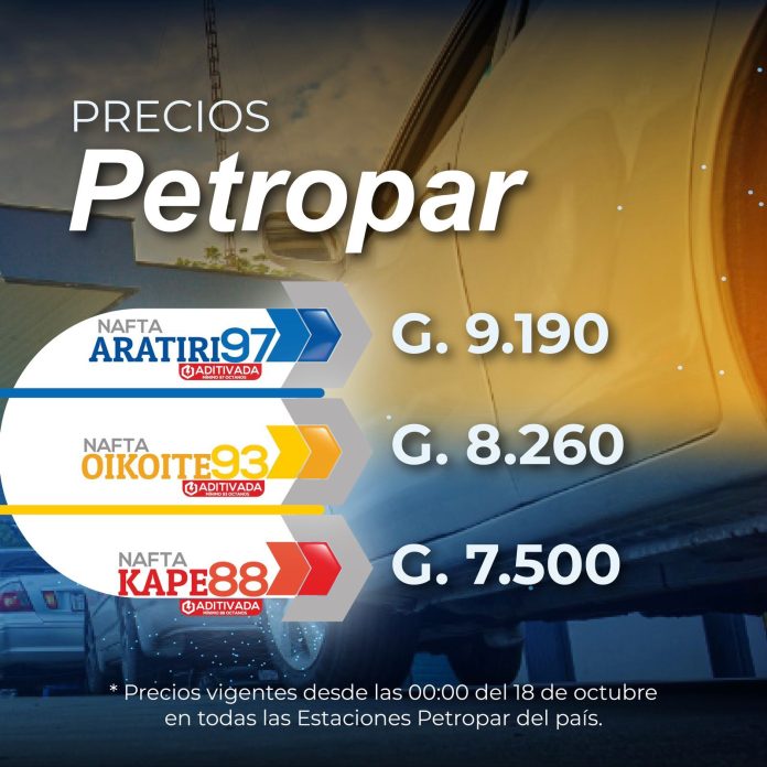 A estatal paraguaia Petropar anunciou que a partir desta terça-feira, 18, entraram em vigor os novos preços de combustíveis no país, com redução de 150 guaranis por litro (R$ 011) das gasolinas 97 octanas (Aratirí), 93 octanas (Oikoite) e 88 octanas (Kape).